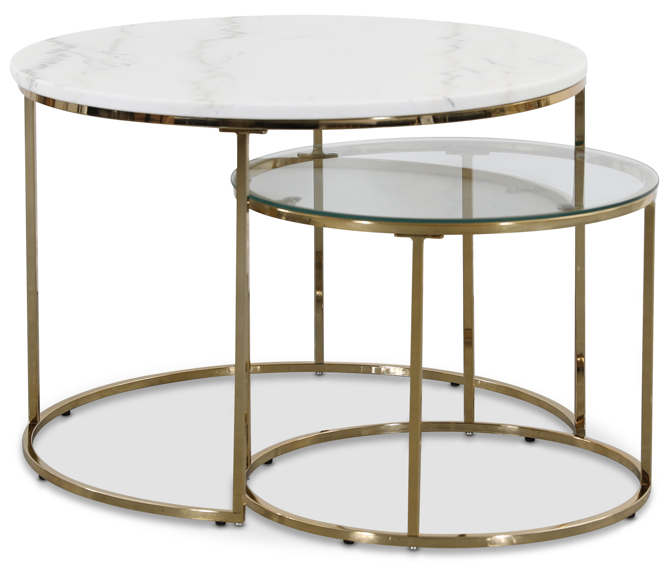 Elegant og eksklusivt satsbord med et stilrent design. Beina og rammen er produsert i messing med bordplate i hvit ekte marmor, samt at det lille satsbordets plate er i glass. Bordet passer perfekt inn i hjemmet, sammen med de fleste sofagruppene.