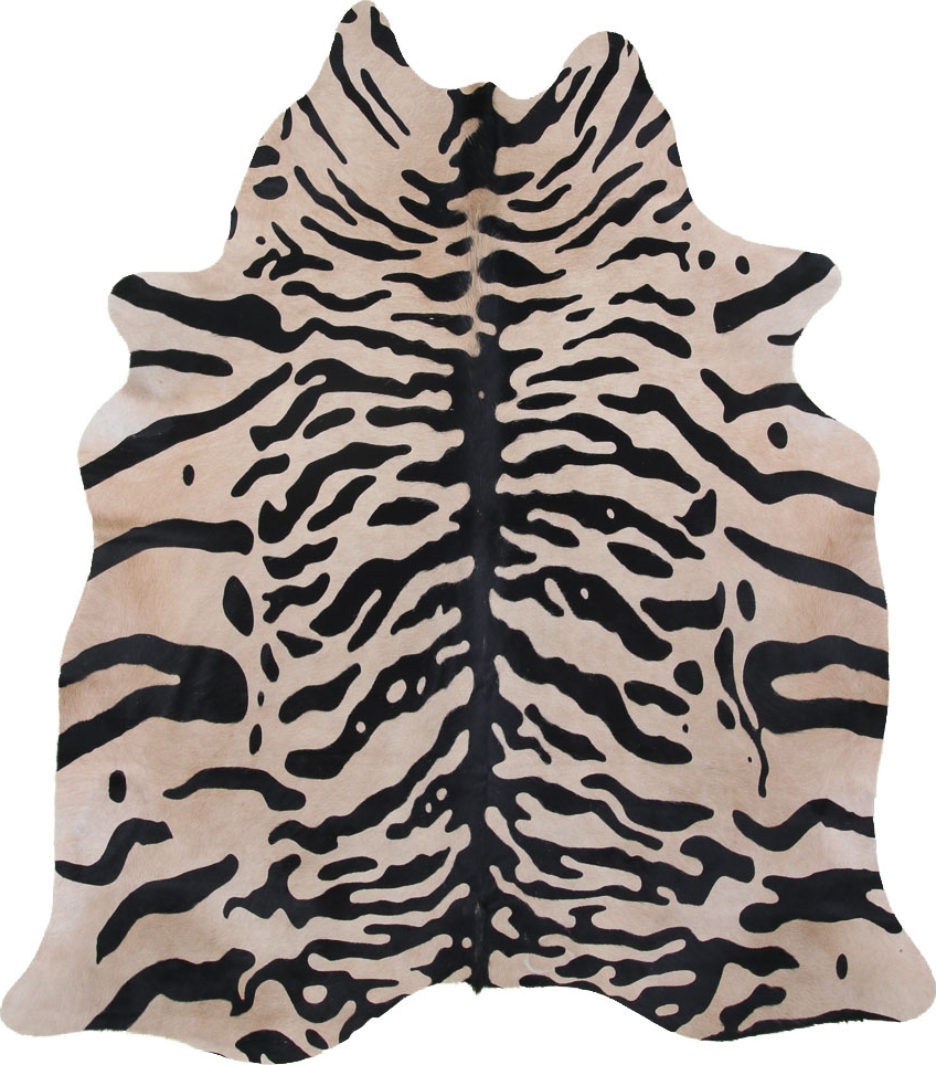 Moderne teppe i ekte okseskinn med tigermønstertrykk. Teppene er unike og kan variere i form og farge. De er lette å ta vare på, slitesterke og passer under en sofa, spisestuegruppe eller til og med i hallen.