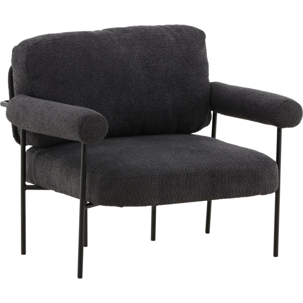 Lenestol som øker hyggefaktoren i stua. Det sjenerøse setet sammen med den myke ryggstøtten og avrundede armlenene skaper en ekstraordinær komfort. Lenestolen er kledd i et grått bouclestoff og har svarte stålben. Plasser ved siden av sofagruppen eller hvorfor ikke alene som en vakker interiørdetalj. De nordiske formene og det nostalgiske designet skaper et herlig blikkfang i ethvert rom og er lett å matche med andre møbler.
