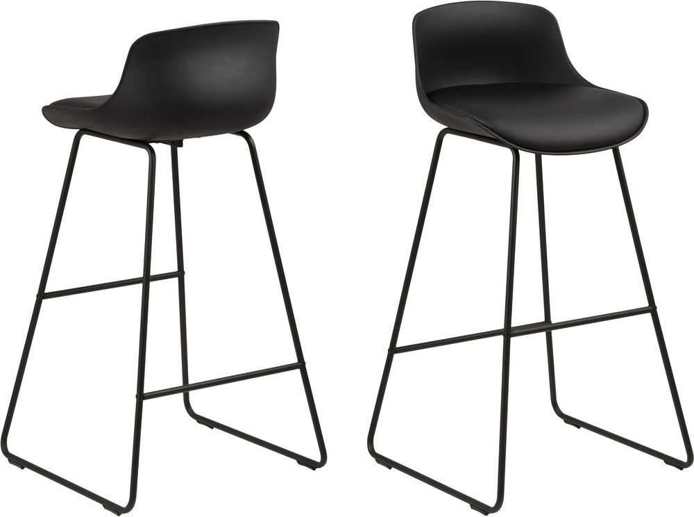 Barkrakk med ramme laget av sort pulverlakkert metall og sete i svart plast med sittepute kledd i svart kunstskinn.