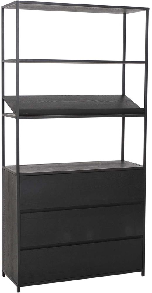 En nydelig hylle med moderne design. Rammen er laget av sort pulverlakkert metall, skuffene og hyllene er laget av sort ask. Tre hyller og tre skuffer for smart oppbevaring, samt en bokhylle som kan settes på ønsket hylle.