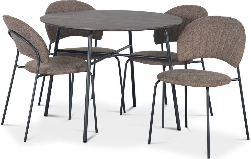 Tofta spisegruppe bestående av et bord på Ø100 cm med topplate av MDF i mørk treutførelse, understell av svart pulverlakkert metall. Inkludert 4 stk. Hogrän stoler med brunt trekk og svart ramme. En spisegruppe i stilig moderne design. Fokus på et minimalistisk design og fargevalg som passer godt sammen.