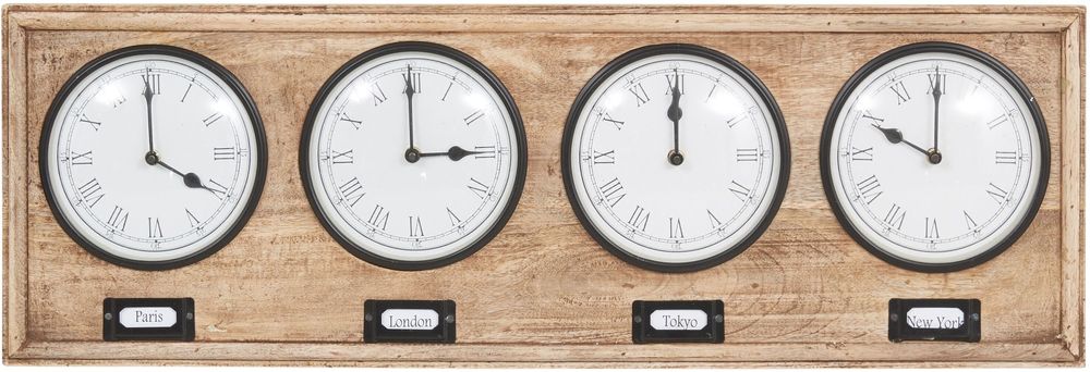 Stilig kllokke i gammeldags stil der man kan se tiden i forskjellige tidssoner.