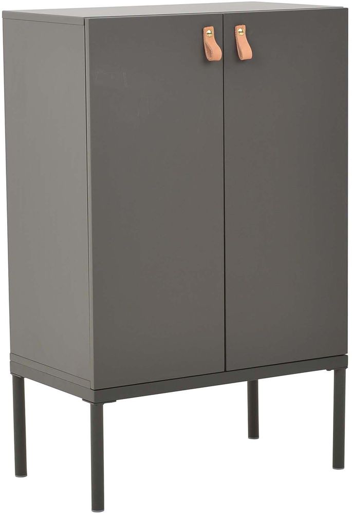 Tøft skap i grått med én hylle. Håndtakene til skuffene er i skinn.