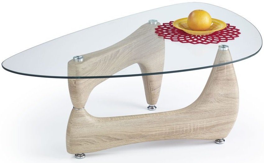 Herlig sofabord med et moderne design. Bordplaten er laget av klarglass og underdelen er i MFP (premium treplate) med et herlig eikelaminat.