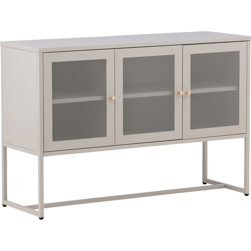 Trerike - et moderne skap i tøft industridesign med lekre nettingdører og ben laget av beige pulverlakkert stål med 2 smarte hyller for avlastning. Skapet løftes opp av smale, høye ben som skaper en luftig følelse og også gjør det lettere for støvsugeren. Det perfekte oppbevaringsmøbelet for alt du ønsker deg - fyll med servise, bøker eller vakker dekorasjon. Skapets fleksible størrelse og elegante eksteriør gjør det enkelt å plassere og passer godt inn i de fleste rom i boligen, så møbler etter dine egne behov og ønsker.