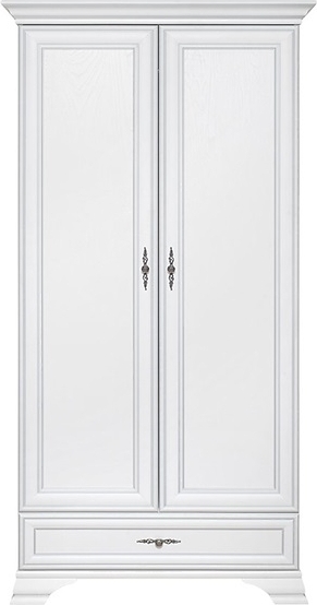 En praktisk garderobe i hvitt med doble dører. Garderoben er innredet med funksjonelle hylleplan og nederst er det en praktisk skuff. Med de dekorative håndtakene i metall og de fine detaljene på fronter og ben blir møbelet et klassisk innslag i din innredning