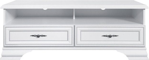 En fin multimediabenk i hvitt med to skuffer og to åpne rom. De forborrede hullene bidrar til å holde orden på kablene, men fungerer også som ventilasjon. Med de dekorative håndtakene i metall og de fine detaljene på fronter og bein, blir møbelet et klassisk innslag i dinn innredning