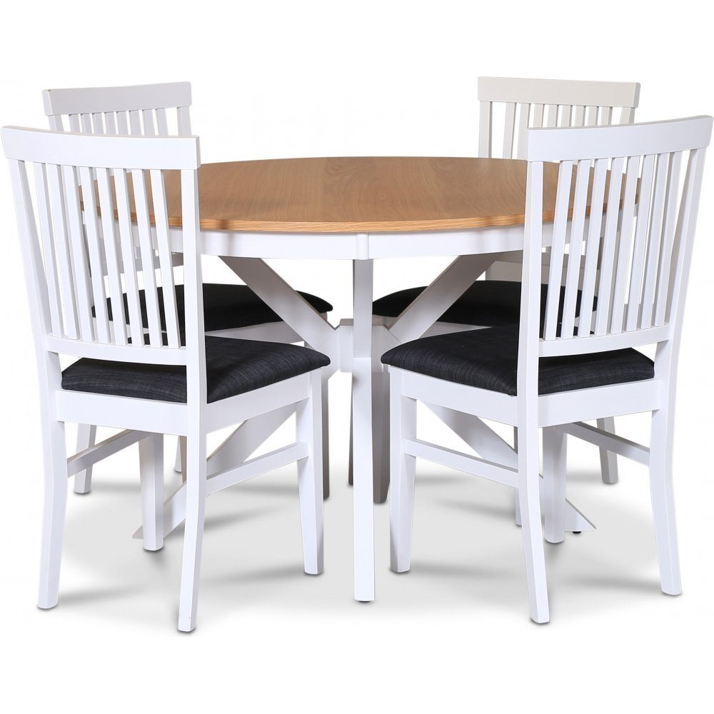 - Tromsø spisegruppe; rundt spisebord 120 cm - Hvit / oljet eik med 4 Fårö stoler med sete i grått stoff