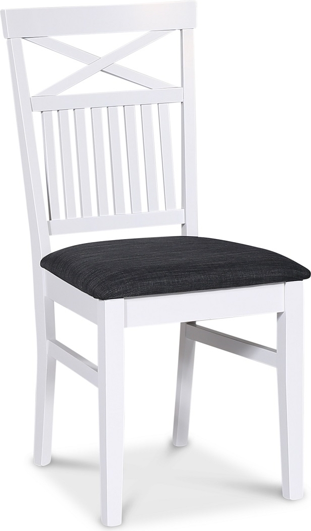 Tromsø spisegruppe fra Skånska Möbelhuset, klassisk rundt spisebord 120 cm i diameter med hvit understell og et bordplate i oljet eikefiner. Det inkluderer 4 matchende Skagen spisestoler i hvitlakkert tre, kryss i ryggen og sete i grått stoff.
