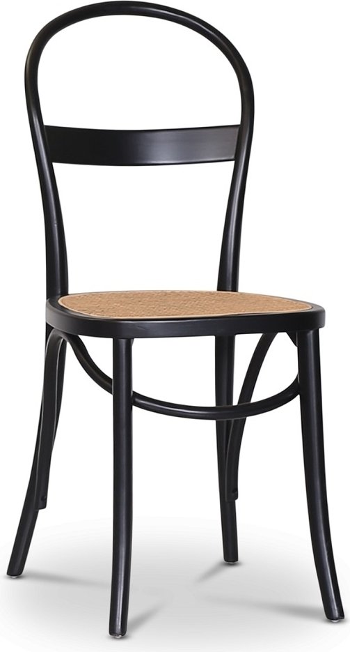 Tromsø spisegruppe fra Skånska Möbelhuset, rundt spisebord 120 cm i diameter med hvit understell og en bordplate i oljet eikefiner. Det inkluderer fire matchende Danderyd spisestoler i svartlakkert tre med rottingsete.