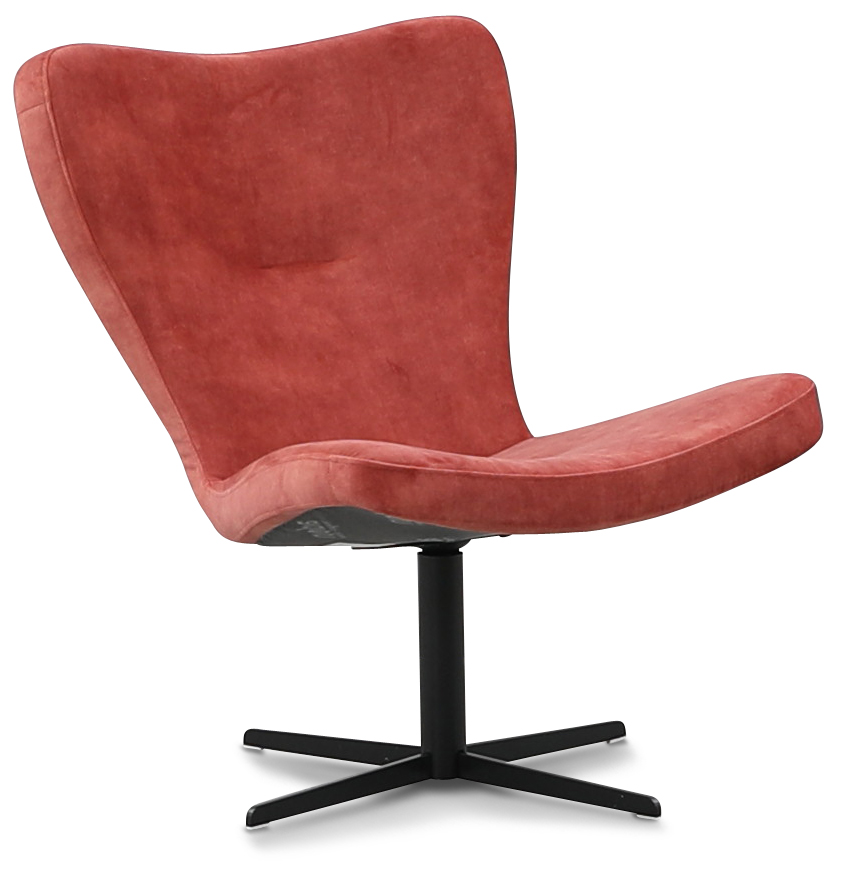 Spekeröd er en roterende lenestol med ekte dansk design. Klassisk design i et mykt og fløyelsaktig korallfarget tøystoff. Spekeröd bruker elastisk kaldskum i både seter og rygg for å gi en god komfort og en lang levetid. Snurrestativet er lakkert i mattsvart stål.