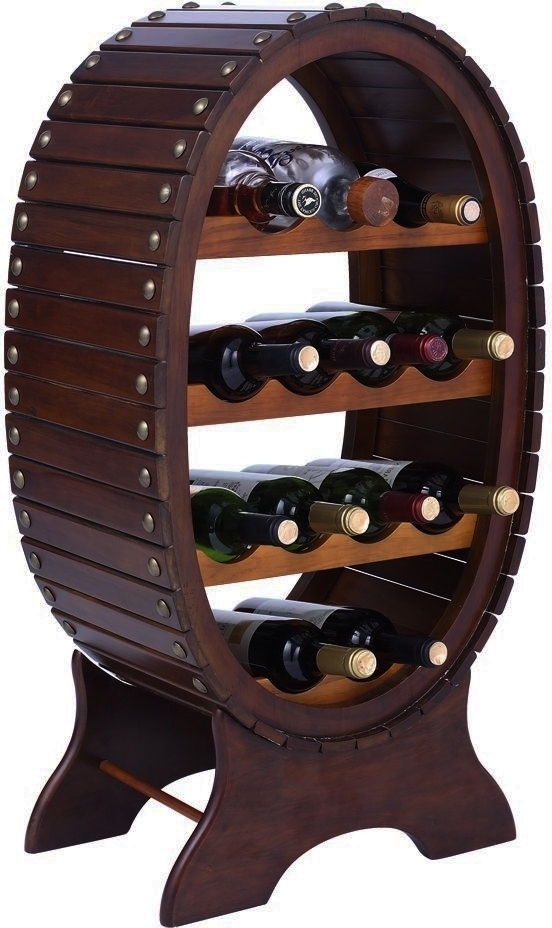 Vinstativ i oval form, laget av MDF i brun utførelse. Et dekorativt vinstativ med plass for en mindre vinsamling.