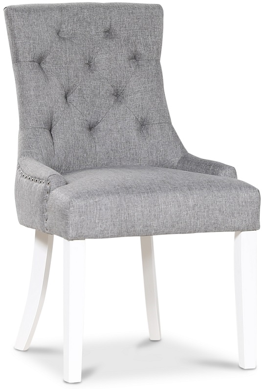 Eastport spisestol kledd i et klassisk slitesterkt lysegrått linlignende stoff, samt hvitlakkerte ben. Stolen prydes av krommede nagler langs kanten på stolryggen. Stolen er vellaget og en av våre mest populære stoler.