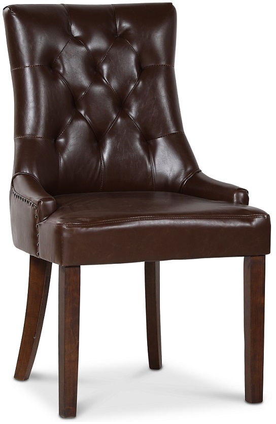 Tuva New Port stol med håndtak i ryggen, kledd i brunt PU (kunstskinn) med vintageutseende og brune ben. Stolen prydes av antikkfargede nagler som en fin detalj! Stolen er velarbeidet og en av våre bestselgende spisestoler.