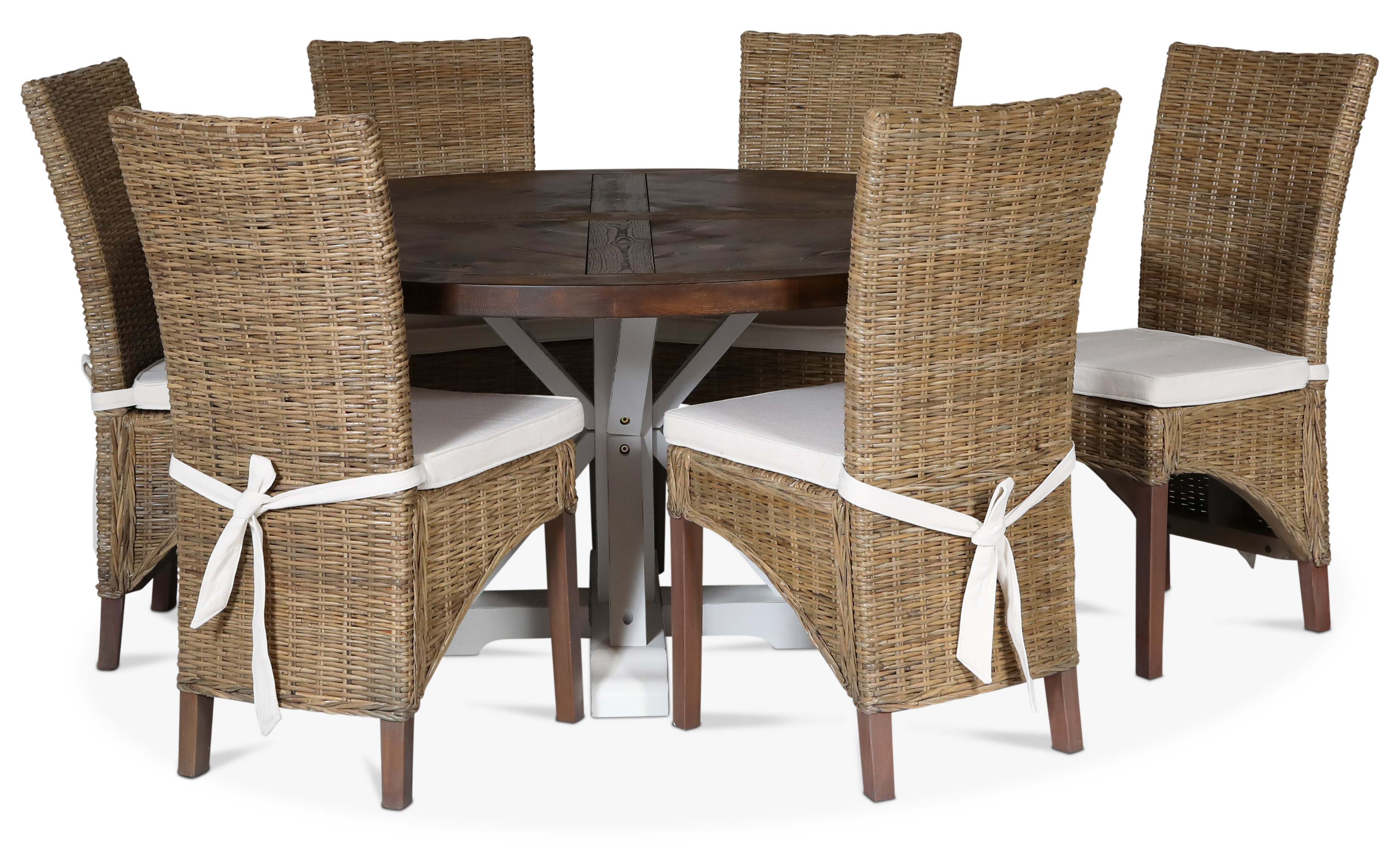 Tuva spisegruppe; rundt spisebord, Drivved /Hvit + 6 Croco spisestoler med pute