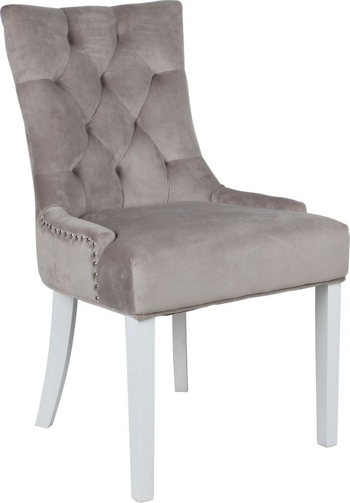 Spisestol i beige fløyel med kromnagler og ringhåndtak i ryggen. Spisestolen har hvitlakkerte treben. Hver stol er nøye utformet for å sikre både kvalitet og holdbarhet. Tuva-stolen er mer enn bare en spisestuestol; Det er en dekorativ detalj som løfter hele spiseområdet. Perfekt til både hverdagsbruk og festlige anledninger når du ønsker å invitere til samhold og stil.
