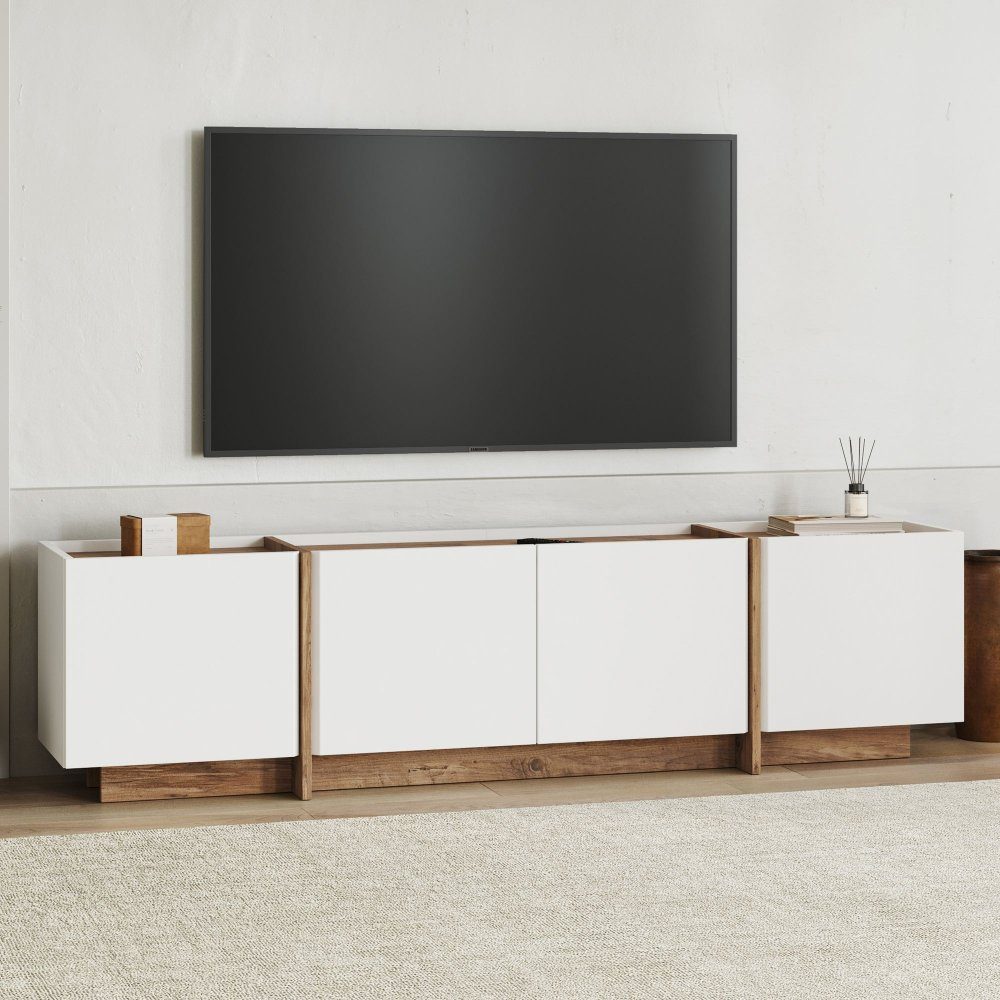 TV-benken tilbyr praktisk oppbevaring bak flere dører der hyller gjør det enkelt å organisere spillkonsoller, fjernkontroller, kabler og annet medietilbehør. Dørene er utstyrt med myklukkende hengsler som sikrer at de lukkes mykt og stille.