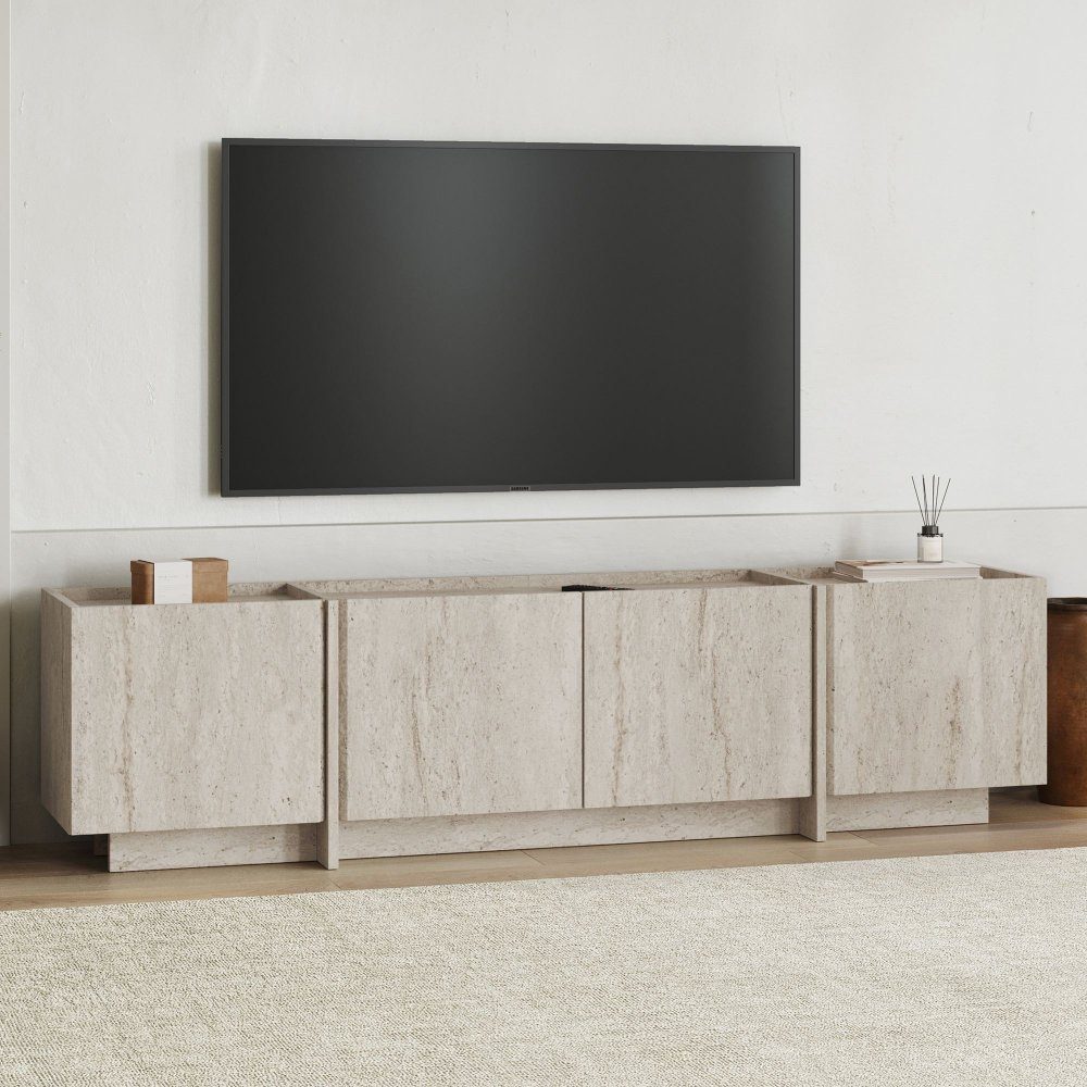 Lorensa er et moderne TV-benk med en stilig travertin-inspirert overflate som gir stuen et lyst og elegant uttrykk. Den lave og avlange designen gjør møblene godt egnet for TV- og medieutstyr, samtidig som de bidrar til en harmonisk helhet i rommet.