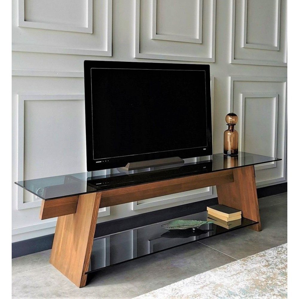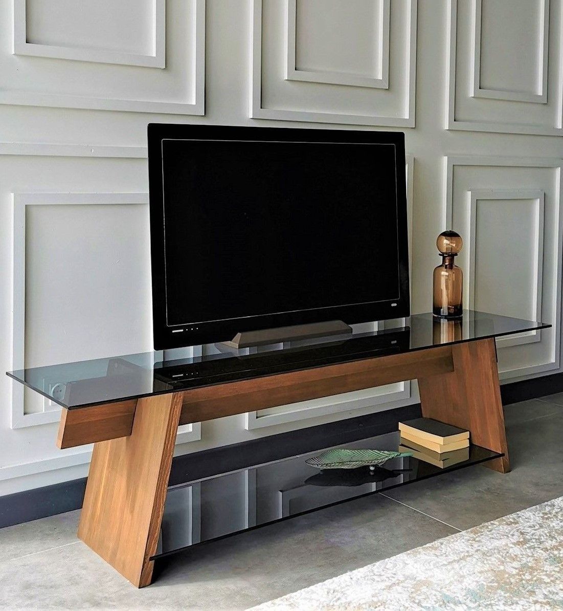 Mediebenk laget av tre og temperert glass.