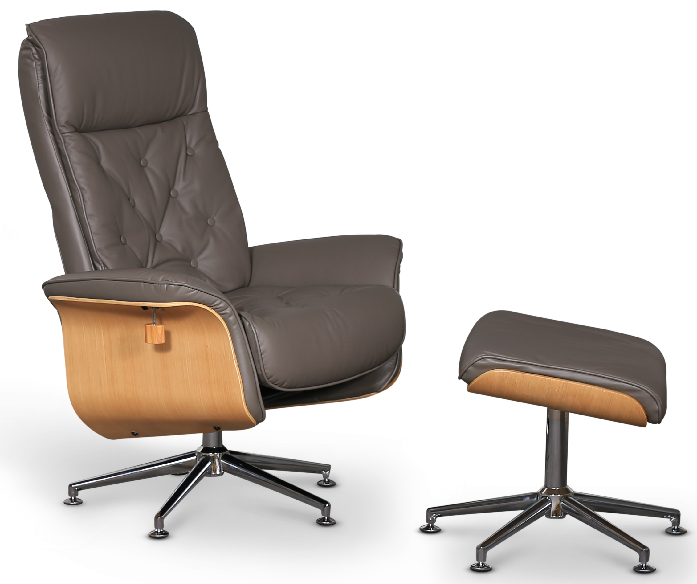 Her i grått skinn / PVC med tre på sidene, design i oljet eik og stativ i forkrommet metall for å gi et eksklusivt utseende og en unik følelse. Reclinerfunksjonen kan stilles inn og låses i forskjellige posisjoner. Matchende fotskammel følger med.