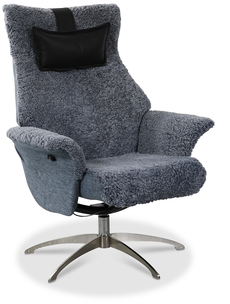 Ullrik lenestol i fåreskinn er en klassiker med skjønn komfort. Ekte lysegrått fåreskinn. Recliner funksjon med snurrestativ. Nakkepute i svart skinn.