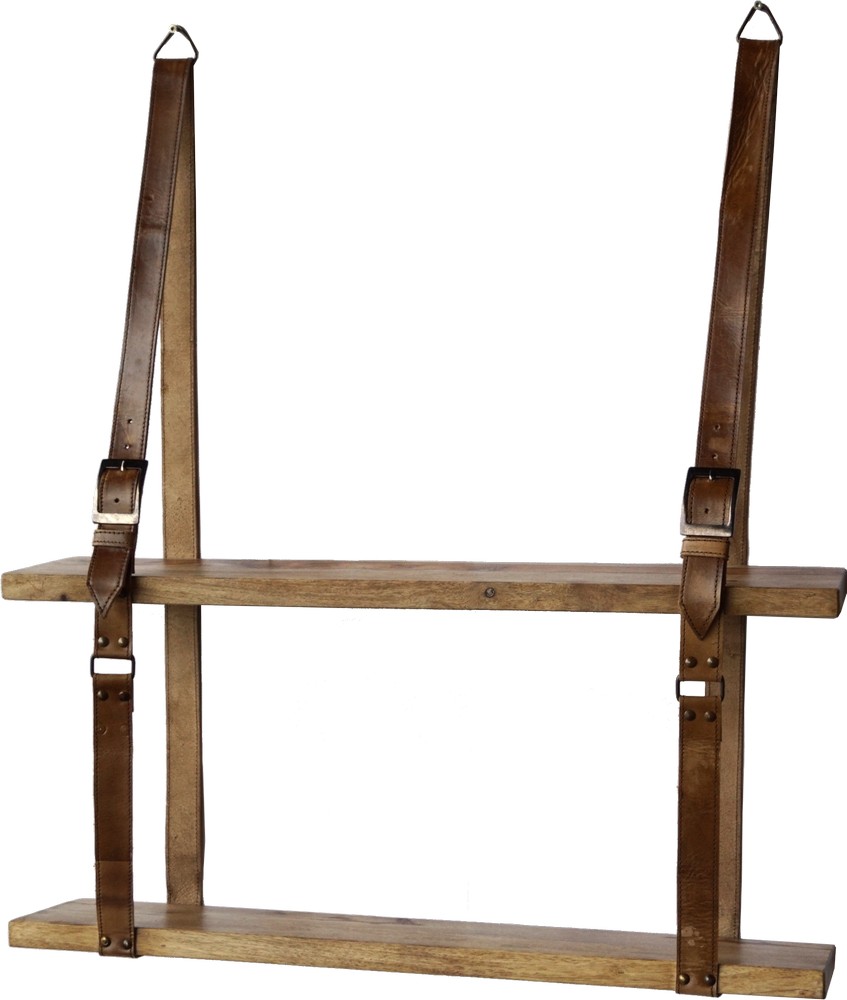 Vegghylle bestående av to hylleplan i mangotre, opphengt på to beltelignende lærreimer. En annerledes hylle sm setter et personlig pre på innredningen. Hver hylle er unik og kan derfor ha ulik finish.
