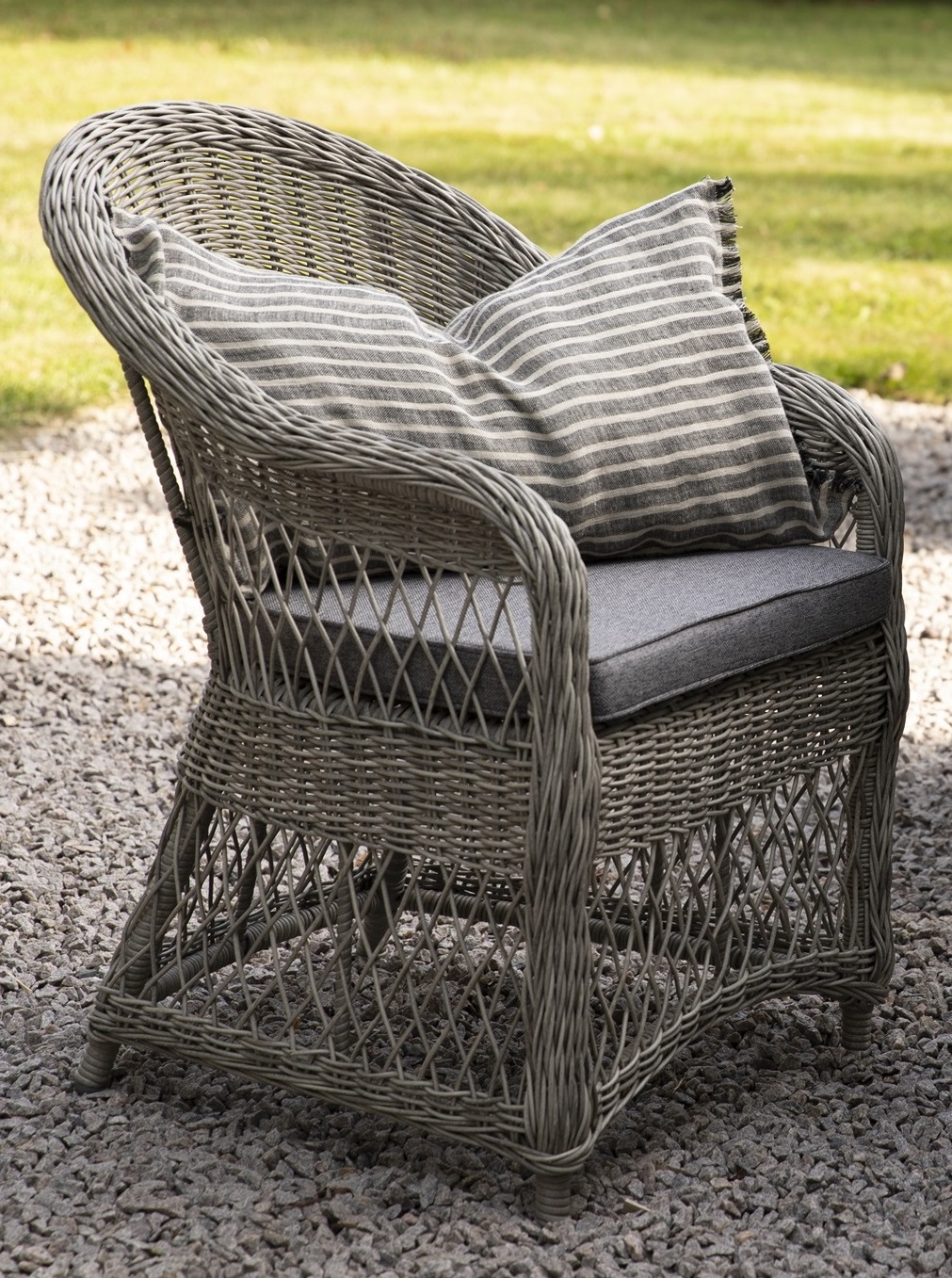 Utegruppe Marbella: Scottsdale rundt grå/hvitt spisebord Ø112 cm inkl. 4 Marbella lenestoler med sitteputer. En harmonisk spisegruppe hvor m?blene passer fint sammen og skaper en helhet som er vanskelig ? sl?. Passer like godt i vinterhagen som p? plenen.