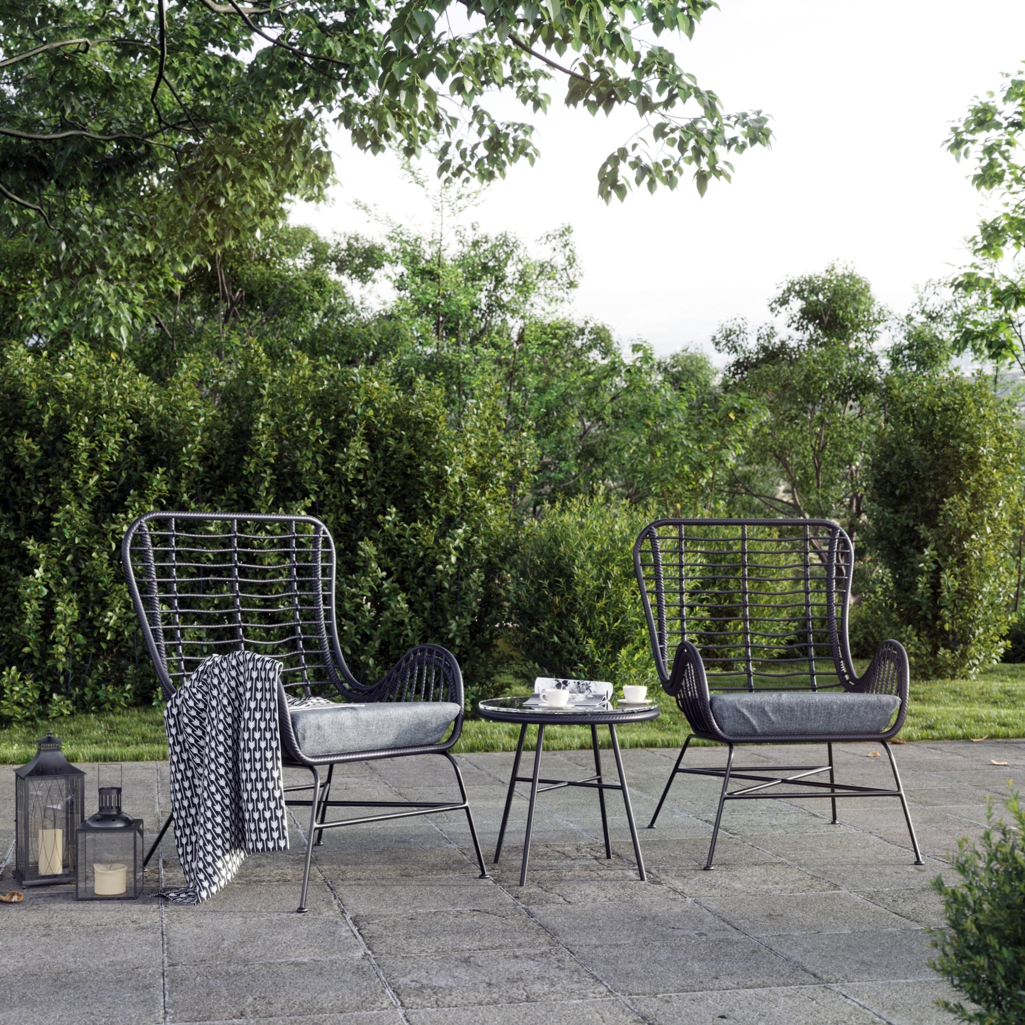 Fin liten utemøbelgruppe laget av mørk kunstrotting som passer lett blant andre møbelstiler. Møbelgruppen består av to rottingstoler og et bord med 5mm glassplate.