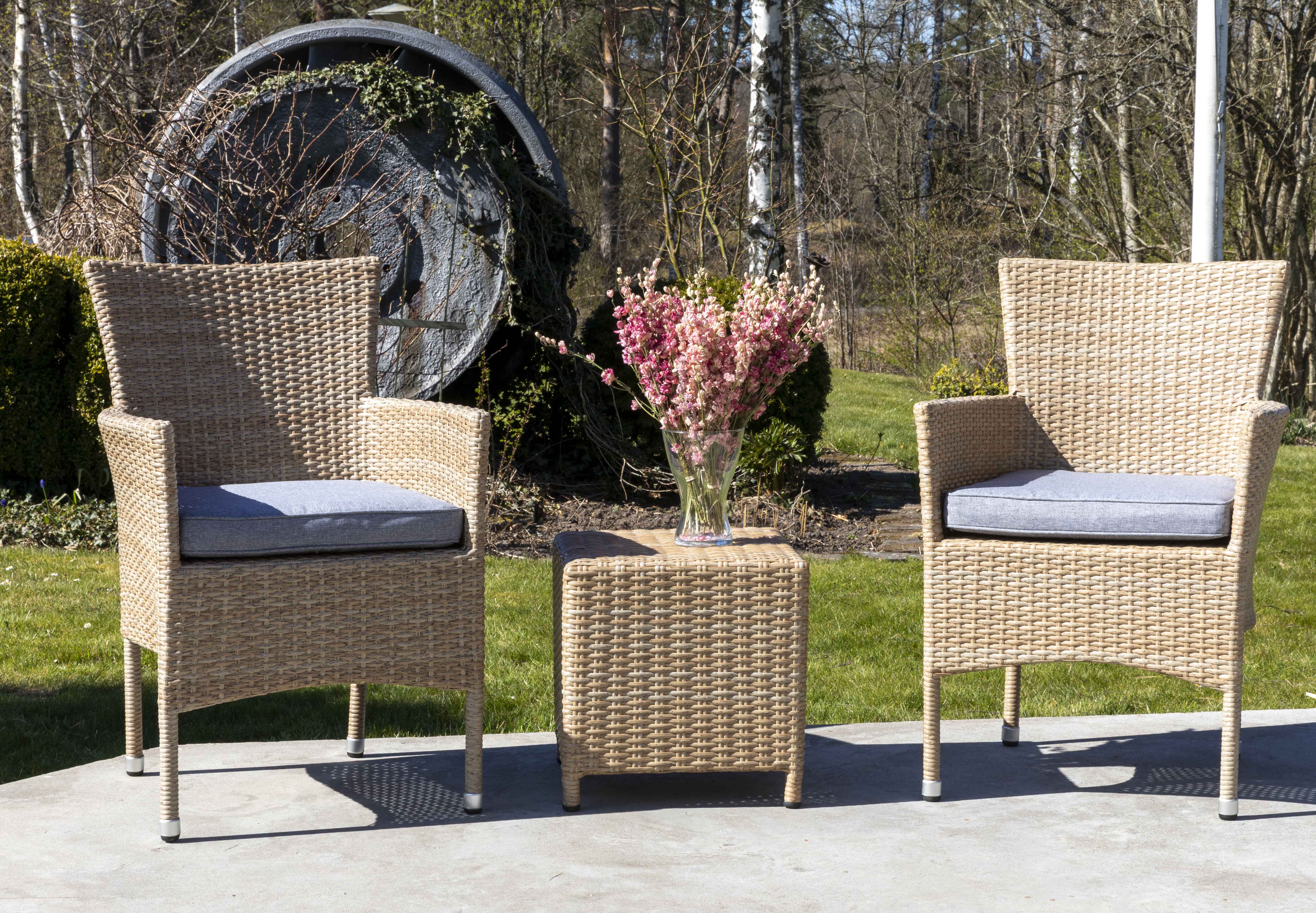 Lenestolsett Vancouver med to komfortable lenestoler med puter og et sidebord, alt i matchende naturfarget kunstrotting. Passer bra til avkobling ute på uteplassen, terrassen etc.