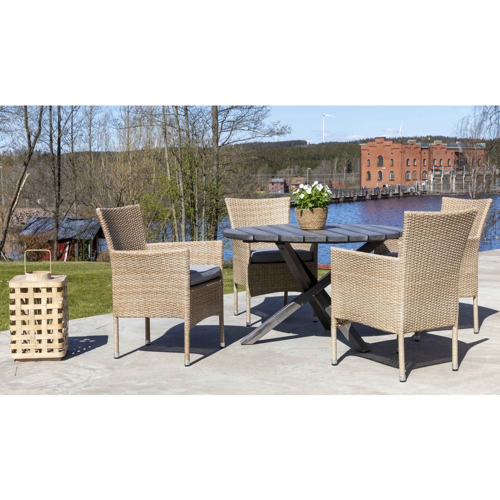 Vancouver spisegruppe gir deg en utemøbelgruppe i nøytral naturfarget kunstrotting som passer fint i hagen. Møbelgruppen består av et rundt solid spisebord med 4 stk. matchende komfortable lenestoler med puter.