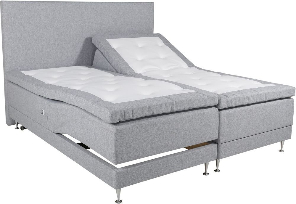 Fjærmadrassen kommer i 2x90 (180) cm og består av 15 cm høye pocketfjær med 5 komfortsoner som følger kroppens former, og en stålkonstruksjon med motor fra Linak. Sengen er trinnløst justerbar, i sitte- og liggestilling, som styres ved hjelp av fjernkontroll og gir god komfort. Den pikerte madrassen kommer i 2x90 (180) cm og består av mikrofibervatt og kaldskum. Alt i alt er sengen laget for å gi en god sovekomfort og et enhetlig inntrykk i sitt helkledde design. Hele sengen hviler på 12 cm høye champagneben i sølvfarget aluminium.