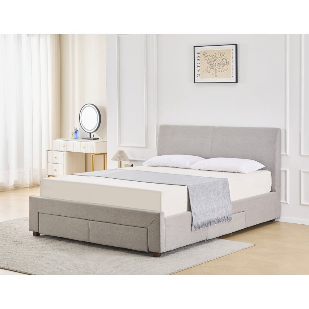 Vaxö sengeramme inkludert sengegavl og oppbevaring. Smarte oppbevaringsskuffer i sengerammen. Grått stoff.