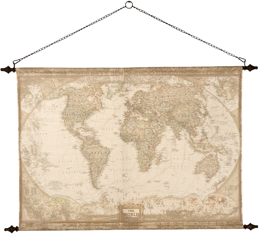 En stor og vakker veggdekorasjon med verdenskartet som motiv. Laget på kanvas som er festet i to rammer og rulles ut til et bilde.
