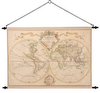 En stor och vakker veggdekorasjon med verdenskartet som motiv. Produsert på kanvas som er festet i to rammer og rulles ut til en plakat.