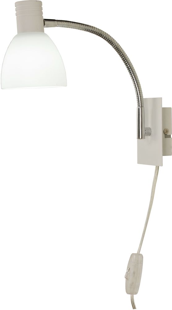 Vegglampe i hvit og krom versjon. Monteres enkelt på veggen. Strømbryter på ledningen.