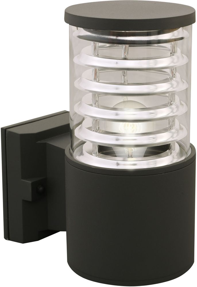 Utendørs vegglampe i mørkegrått metall og klart glass. Monteres enkelt på husveggen.