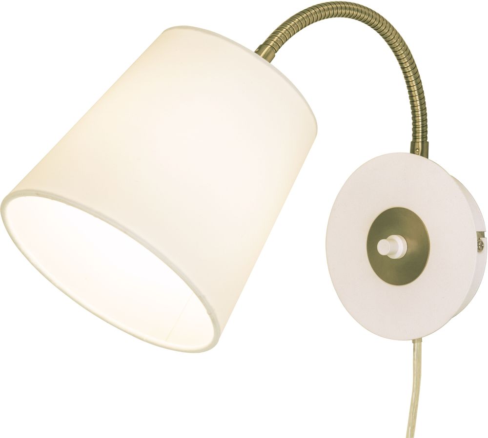 Vegglampe i hvit og messing. Enkel å montere på veggen. Strømbryter på platen.
