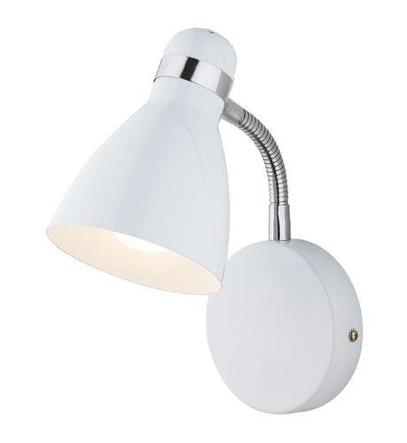 Vektor stilren vegglampe med et nydelig design. Laget i hvitt metall med detaljer i krom. 2 meter ledning med strømbryter på ledningen. Liten lampeholder (E14). Max 40W lyspære eller tilsvarende styrke i halogen, lavenergi eller LED. Lampen passer perfekt inn i flere ulike miljøer i hjemmet.