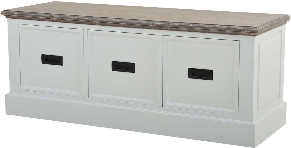 Moderne benk i hvitt med topplate i grått, utrustet med tre skuffer for effektiv oppbevaring. Sorte håndtak som bryter av det hvite på et harmonisk vis. Et praktisk møbel som tar seg bra ut i de fleste hjem.