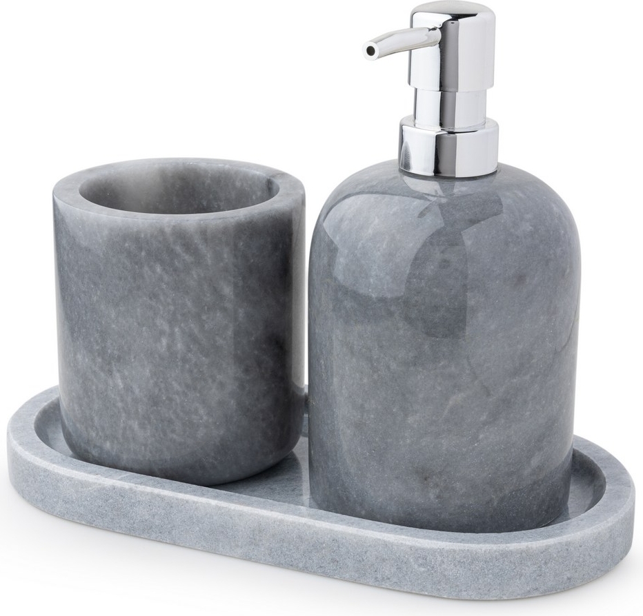 Baderomssett i grå marmor fra Verona med såpedispenser, krus og underlegg.