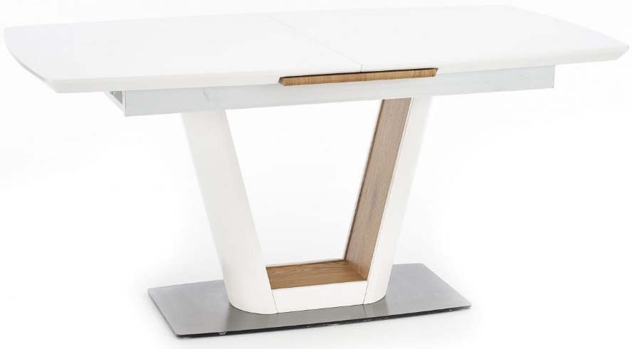 Et pent spisebord med et moderne design. Bordplaten er laget av lakkert MFP (premium treplate) og underdelen er av en vakker blanding av lakkert MFP (premium treplate), finér og rustfritt stål. Bordet er praktisk da du lett kan forlenge bordplaten opp til 200 cm, tilleggsplate følger med.