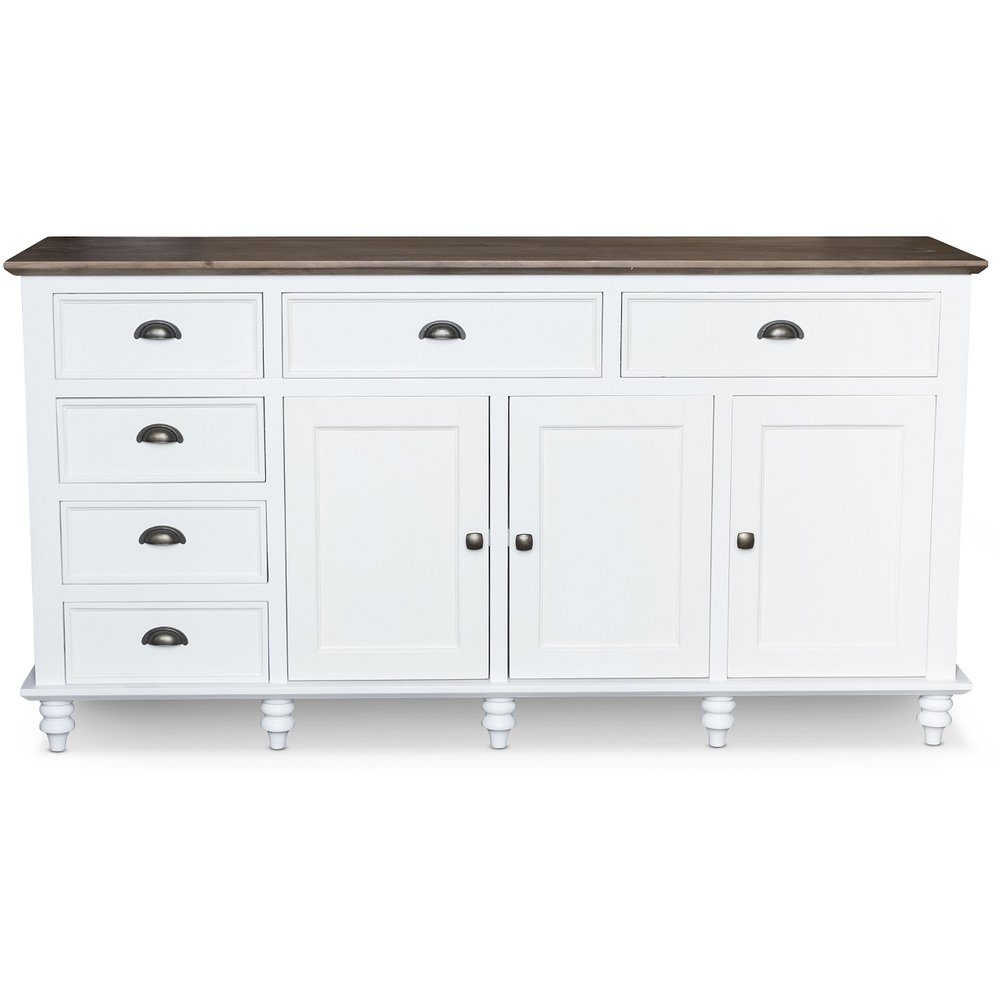Victoria skjenk med hvitmalt ramme og vokset topp i solid gjenvunnet furu som er beiset brunt. Victoria-serien har en fransk romantisk landstil i en vakker kombinasjon.