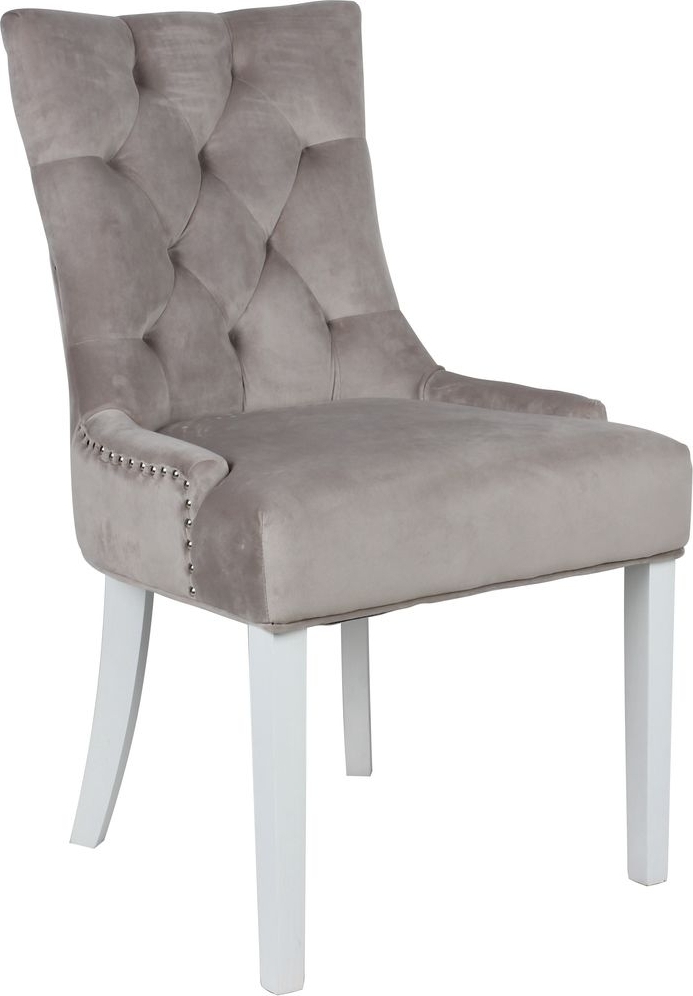 Inkludert 4 stk. Tuva spisestoler i beige fløyel med forkrommede nagler og ringhåndtak bak. Spisestolen har hvitlakkerte treben. Denne serien av stoler er en av Trendrums mest populære.