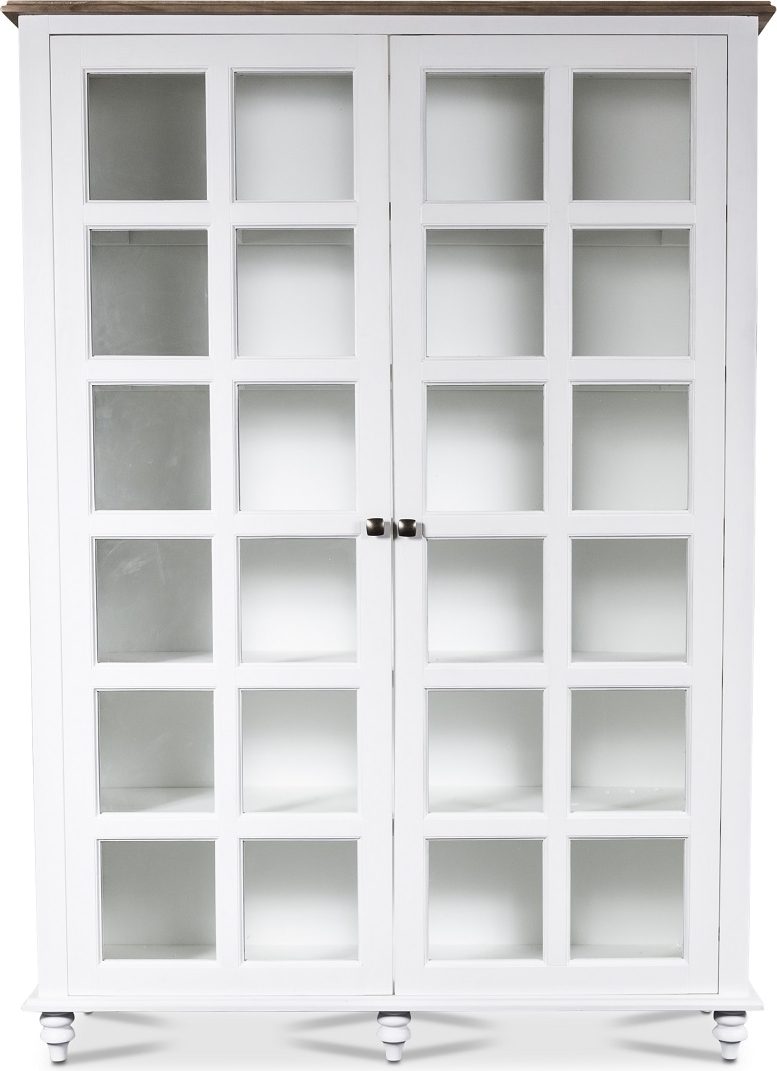 Victoria vitrineskap med hvitmalt ramme og vokset topp i solid gjenvunnet furu som er beiset brunt. Praktisk oppbevaring i hyller innenfor de to glassdørene.