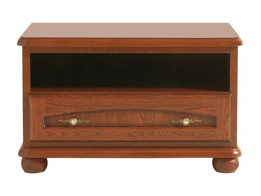 En mediabenk i imitert valnøtt og kastanje. Benken har en romslig skuff og et åpent rom over, med de avrundede formene og messinghåndtakene blir benken et klassisk innslag i interiøret ditt.
