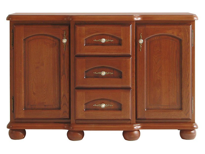 En praktisk skjenk i imitert valnøtt og kastanje. Skjenken har to skap og tre skuffer i midtseksjonen, noe som gjør den svært romslig. Med sine avrundede former og messinghåndtak blir møblet en klassisk interiørdetalj i hjemmet ditt.