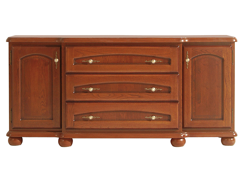 En praktisk skjenk i imitert valnøtt og kastanje. Skjenken har to skap og tre brede skuffer i midtpartiet, noe som gjør den svært romslig. Med sine avrundede former og messinghåndtak blir møblet en klassisk interiørdetalj i hjemmet ditt.