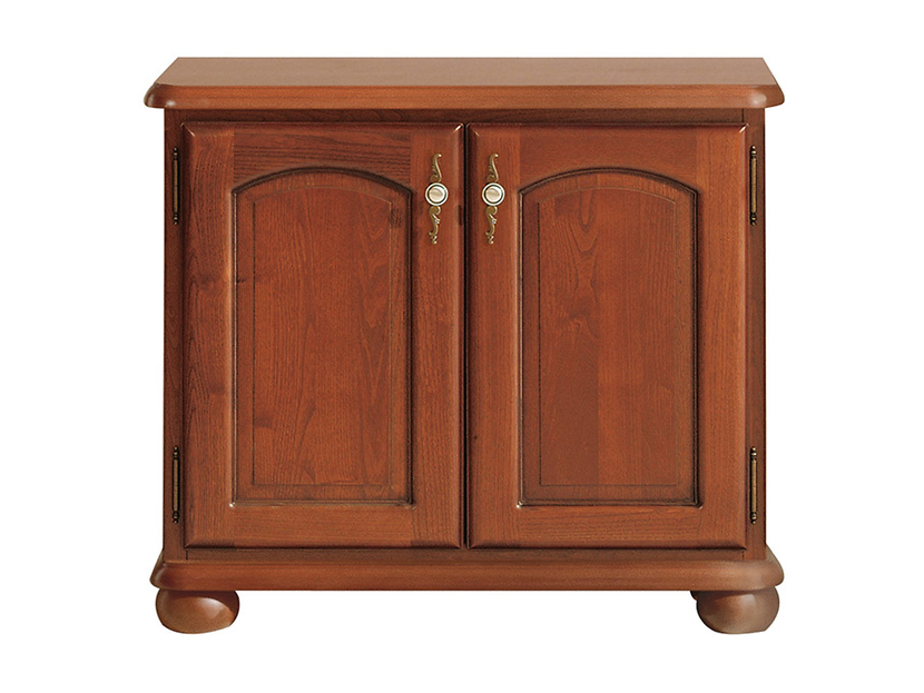 En praktisk skjenk i imitert valnøtt og kastanje. Skjenken har to dører og en god oppbevaringsflate øverst. Med sine avrundede former og messinghåndtak blir møblet en klassisk interiørdetalj i hjemmet ditt.