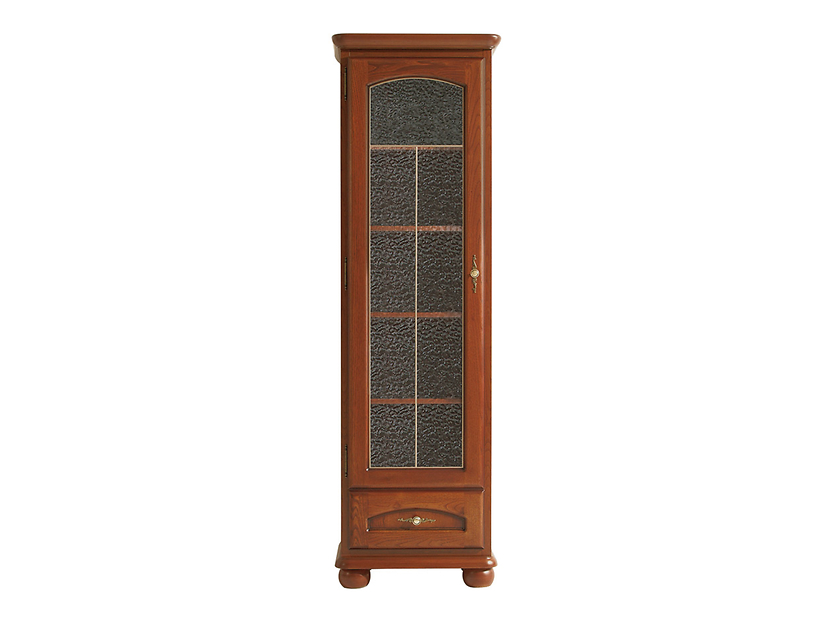 Et fint vitrineskap i imitert valnøtt og kastanje, med en praktisk skuff under. Sammen med de avrundede formene og messinghåndtakene blir møblet et klassisk innslag i hjemmet ditt. Døren er venstrehengslet.